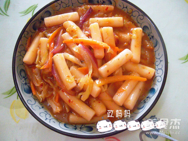 身边有很多朝鲜族朋友,他们都喜欢吃炒年糕,跟朋友学习了做法,味道很不错。 主料 年糕1包 包菜100克 胡萝卜50克 洋葱100克 辅料 辣酱2勺 油2勺 盐适量 辣炒年糕的做法 1.年糕切段备用 2.包菜洗净切丝 3.胡萝卜去皮洗净切丝 4.洋葱洗净切丝 5.辣酱加点水调开加入适量盐调匀 6.锅里油热加入胡萝卜翻炒几下 7.加入包菜洋葱翻炒 8.加入年糕条翻炒 9.加入辣酱翻炒均匀 10.加入适量水煮至汤汁浓稠即可 烹饪技巧 年糕最好买新作的比较软的年糕条做出来比较好吃。辣酱最好用韩国辣酱。