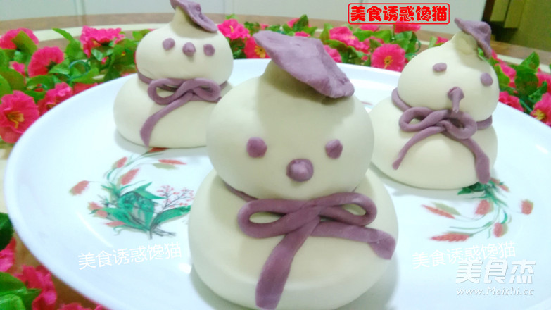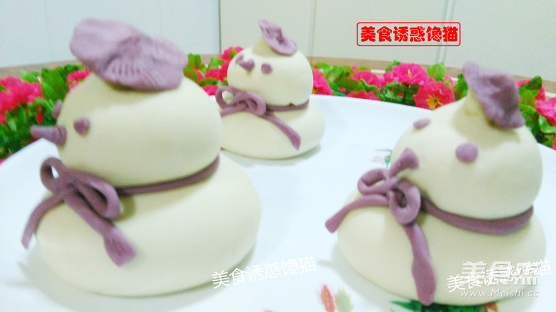 11.粘上帽子、眼睛、鼻子,样子更萌,更生动。包好包子后,放在铺有屉布的蒸笼上,中间要有间隔,因为蒸的时候还会变大。二次醒发20分钟(根据温度调整醒发时间)至二倍大。大火将水烧开,中火蒸20分钟关火,焖5分钟后再揭开锅盖