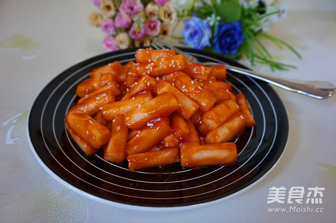 开胃炒年糕。 主料 年糕400克 番茄沙司120毫升 辅料 白糖30克 白芝麻3克 #圣诞节#茄汁年糕的做法 1.准备食材 2.年糕切小段 3.锅中加水烧开,将年糕放入煮软,捞出沥水 4.平底锅热油,倒入年糕条小火煸炒一下再装起来 5.平底锅再热油,挤入番茄沙司和加入白糖炒匀 6.再倒入年糕条翻炒至年糕裹上茄汁即可 7.盛上碟,再洒上芝麻即可 烹饪技巧 无技巧。