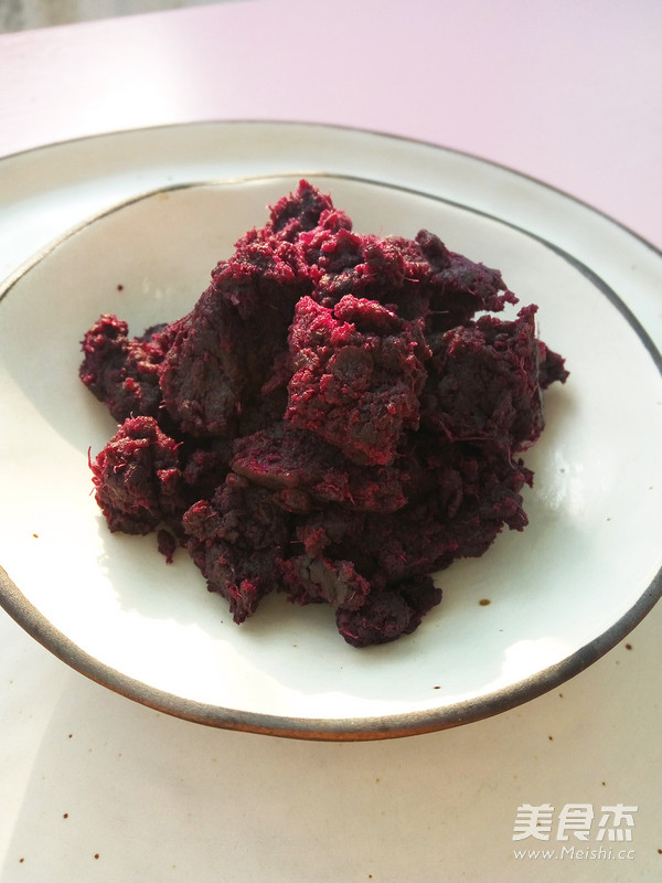 2.将蒸熟的紫薯片放入不粘锅中,趁热捣碎