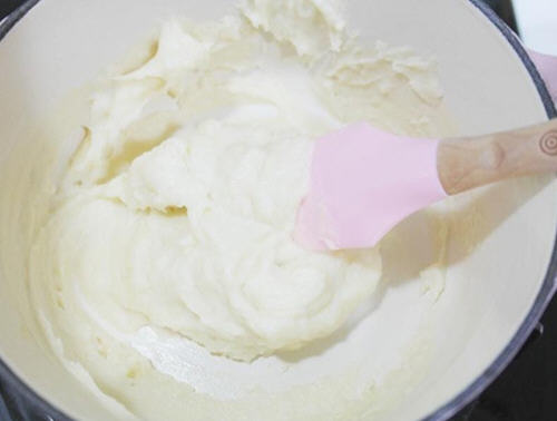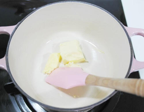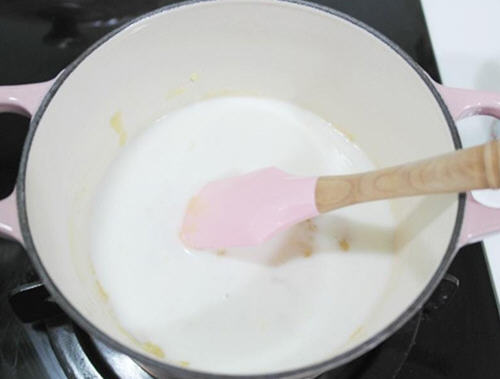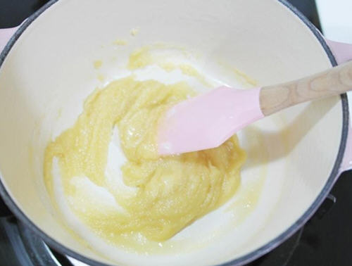2、奶油溶化后倒入面粉。一边搅拌它至无面粉浓稠状态
