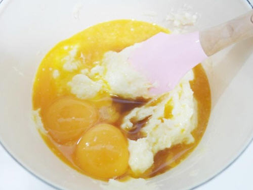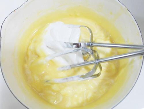 11、把刚刚拌匀的蛋黄液通通倒入打发的蛋白里~~轻轻的混和它们,不要太大力喔。