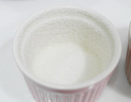 6、倒入砂糖并且旋转烤碗~~让烤碗内部完全都沾满砂糖..多余的砂糖把它轻拍出来!!!一一将烤碗完成此步骤后放入冰箱冷藏备用。