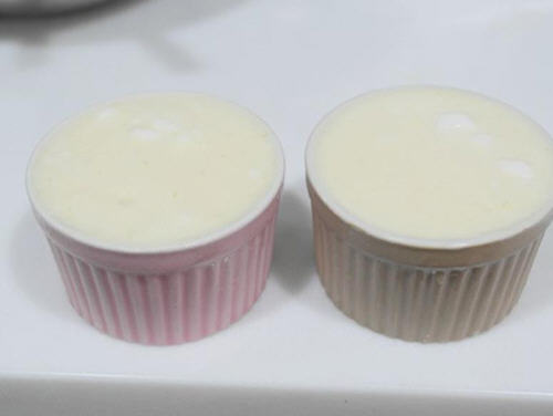 12、接着装进烤碗中~满满的装满然后刮去多余的份量,刮成表面光滑的样子!!!接着放入预热170度烤箱烤约15-20分钟即完成。