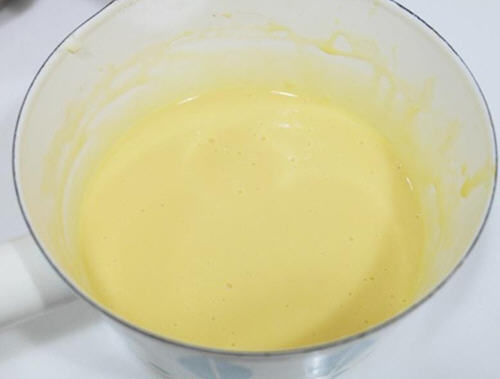 4、过一会儿就会开始凝固啰~~接着熄火!!!牛奶酱糊凝固后放入另一个容器放凉备用。