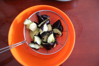 茄子洗净切滚刀块后均匀的撒上些盐腌制10-20分钟。