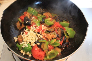放青椒和西红柿,加一勺白糖和适量的盐调味,大火翻炒均匀,中途可以少加一点热水炒制西红柿变软出现红色汤汁。