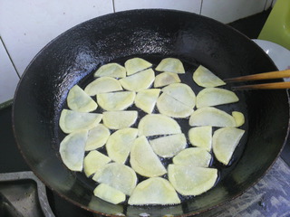 1 把土豆切片,过凉水,控干,锅中放入比平时炒菜多一倍的油,油微热煎土豆片。