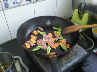 主料土豆(适量)调料青辣椒(适量)胡萝卜(适量)肉片(适量)郫县豆瓣酱(适量)厨具无