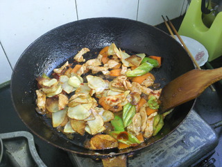 6 下入土豆片,翻炒至没有水分,即可出锅。